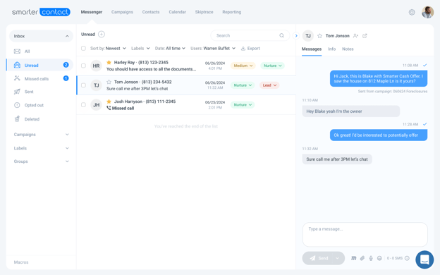 - Stay on top of your conversations with visual indicators displaying the number of unread conversations and missed calls within each inbox. For each conversation, you’ll also see the number of unread text messages in that conversation. You can efficiently manage these statuses by marking marking conversations as read and unread respectively.