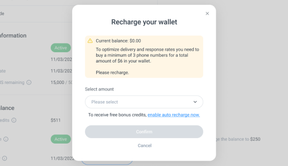 If your balance is insufficient for a number purchase, we'll display a "Recharge your wallet" reminder. After topping up your balance, you can immediately return to searching for a number.
