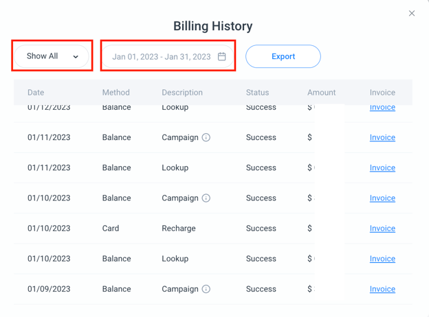 3. In the Billing History pop-up, you can see the following data: Date of charge; Payment method; Description; Status (Succeed/Failed); Amount charged; link to open the Invoice. Filter the charges by the payment method (card, balance, show all) and date range.