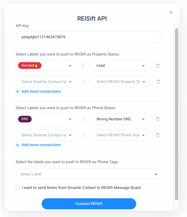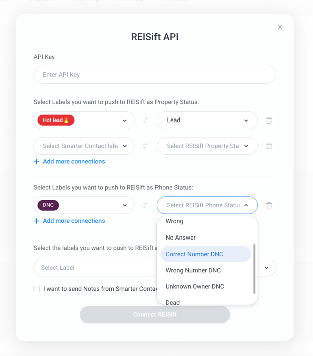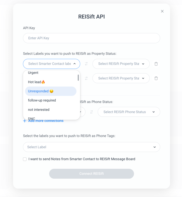 - Select Labels from Smarter Contact and map them with selected Property status from REISift, to push data to REISift as Property Status or Phone Status. You can click +Add more connections to map more labels from Smarter Contact with REISift statuses