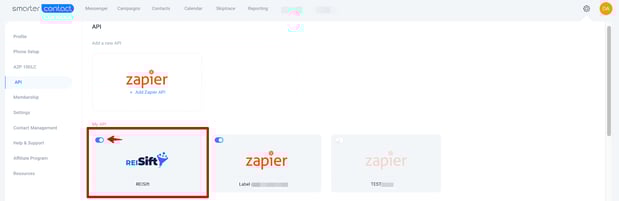 When the integration is set up properly in your Smarter Contact account > Settings > API, you will see the REISift integration toggle is enabled.