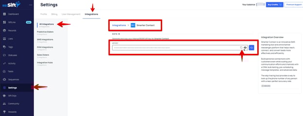- Copy the REISift API Key located within the Settings -> Integrations -> Smarter Contact section of your account.